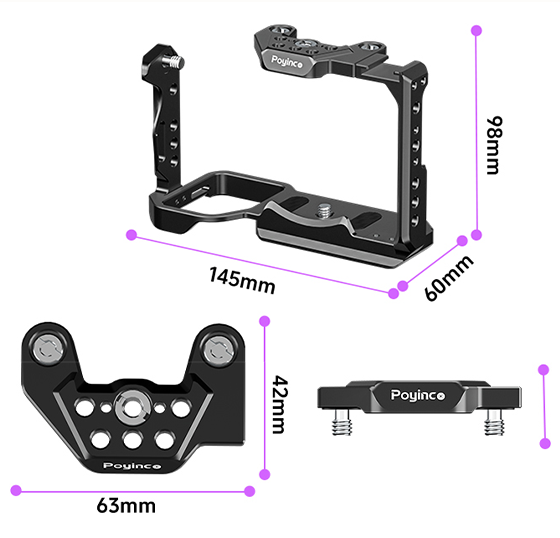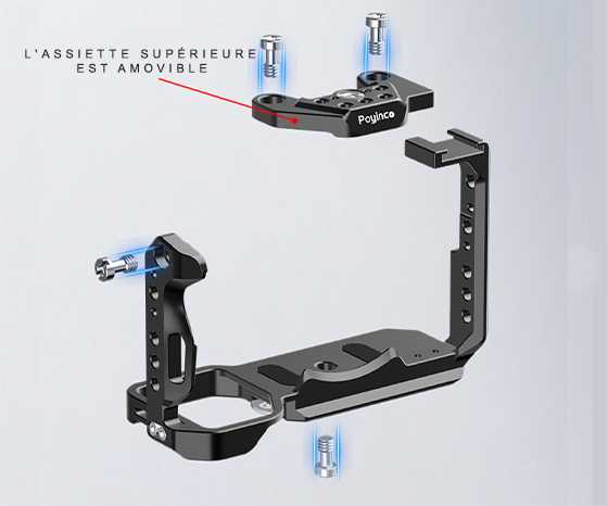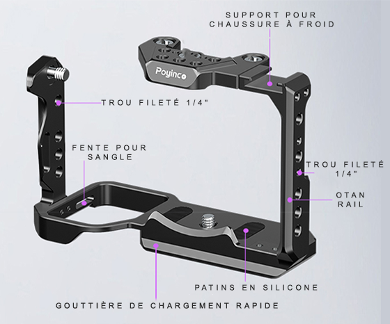 La cage comprend plusieurs points de fixation 1/4" et 3/8" sur lesquels différents accessoires peuvent être montés pour plus d'options de montage et de possibilités de personnalisation.