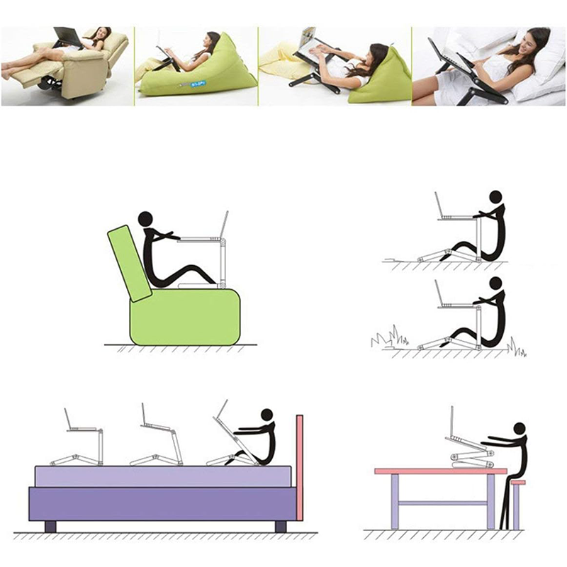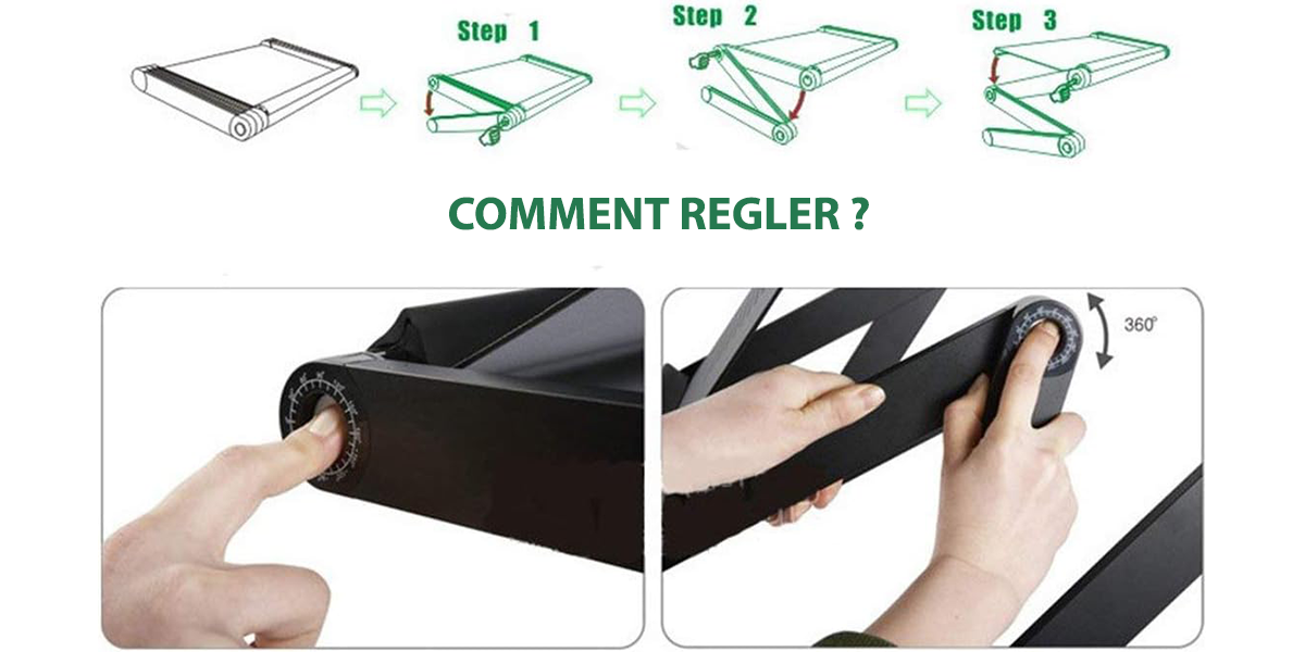 Table pliable réglable pour ordinateur, optimisez votre confort et votre productivité avec ce support d'ordinateur portable multifonctionnel et entièrement réglable, conçu pour s'adapter parfaitement à vos besoins, que vous soyez au lit, sur le canapé ou à votre bureau. Grâce à ses articulations rotatives innovantes à 360 degrés, illustrées par les étapes de réglage simples, vous pouvez personnaliser l'angle et la hauteur idéaux en toute simplicité.